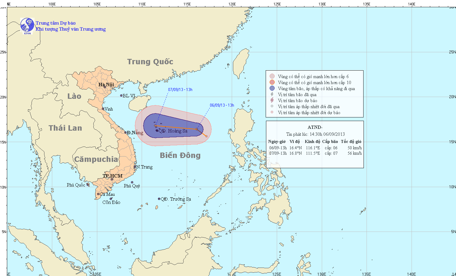 Hồi 13 giờ ngày 06/09, vị trí tâm áp thấp nhiệt đới ở vào khoảng 16,4 độ Vĩ Bắc; 116,1 độ Kinh Đông, cách quần đảo Hoàng Sa khoảng 430 km về phía Đông. Sức gió mạnh nhất ở vùng gần tâm áp thấp nhiệt đới mạnh cấp 6, cấp 7 (tức là từ 39 đến 61 km một giờ), giật cấp 8, cấp 9.